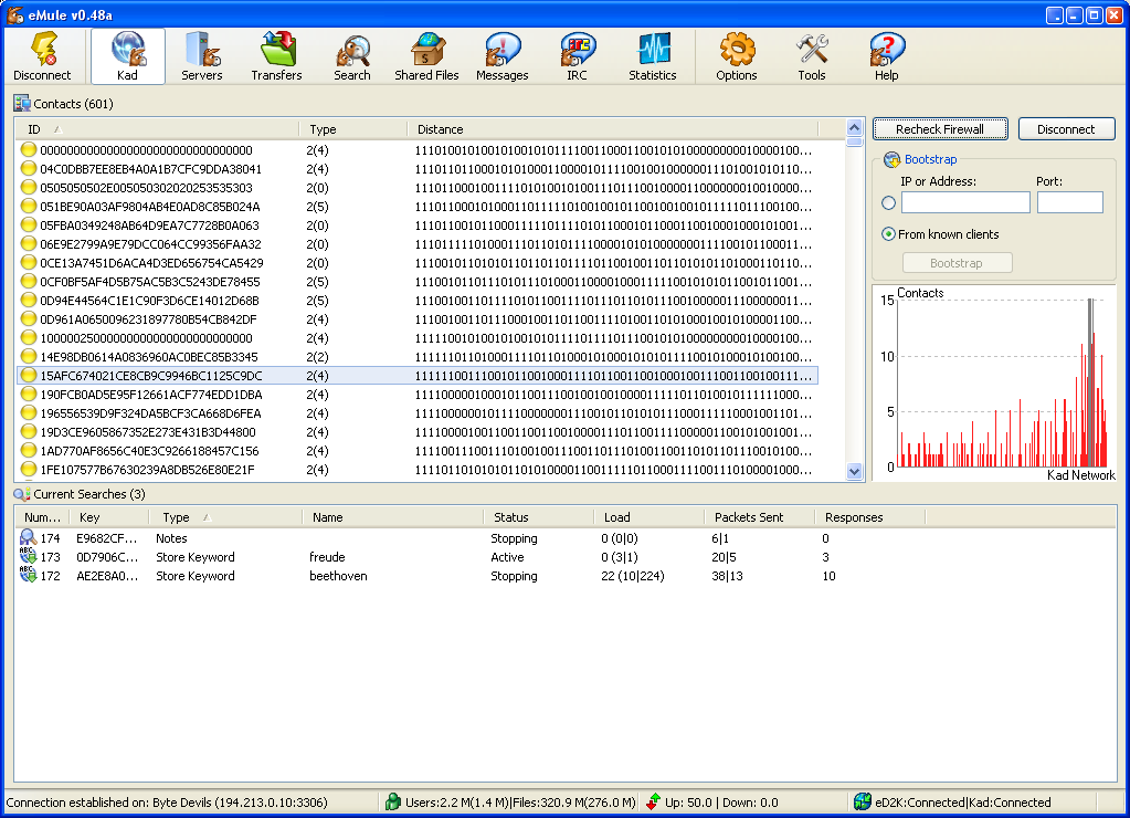 Esto diálogo muestra la mayor parte de la información sobre el soporte Kad de eMule. Es un método de búsqueda sin servidores, basado en el sistema Kademlia (documentación).
