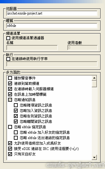 o ±µ¨ü ED2K ³sµ²¦b IRC (¨Ï¥Î³oÓn¤p¤ß!) °²¦p±Ò¥Î³oÓ¥\¯à±N·|¦Û°Ê¦aª½±µ¥[¤J©Ò¦³¦b²á¤Ñ«Ç¤ºªº eD2k ³sµ²¨ì¤U¸ü²M³æ¤¤. Á×§K»E¶°¤£¥²nªº³sµ²À³¸Ó¦P®É¨Ï¥Î ¥u¦³¨Ó¦Û¦n¤Í ³oÓ¿ï¶µ. °²¦p³oӱҥαN¥u·|±µ¨ü¨Ó¦Û³Q¥[¤J¦b eMule ªº °T®§ µøµ¡¤¤ªº ¦n¤Í