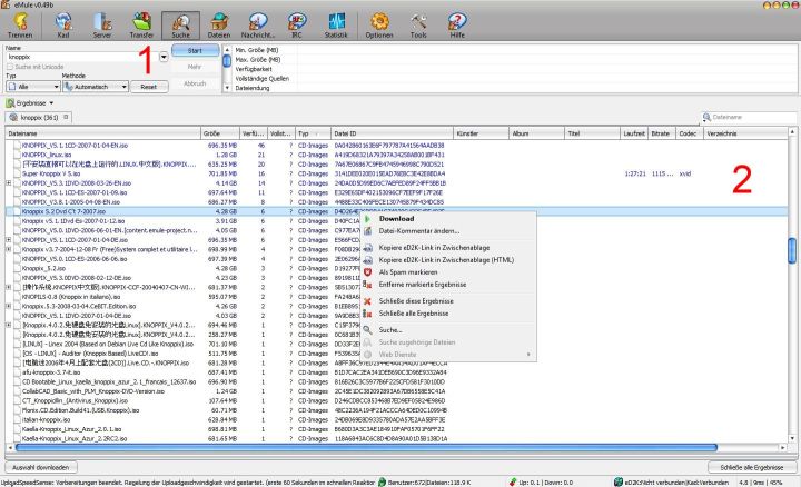 Die Ergebnisse werden in der Suchergebnis Liste (2) angezeigt, je dunkler das Blau ist in dem die Ergebnisse angezeigt werden desto mehr Quellen sind für diese Dateien im Netzwerk verfügbar. Die Spalte "Vollständige Quellen" zeigt dir an wie viele der verfügbaren Quellen diese Datei bereits vollständig heruntergeladen haben (z.B. 50% würde bedeuten dass die Hälfte aller Quellen die Datei noch herunterladen während die andere Hälfte die Datei zum Upload anbietet).