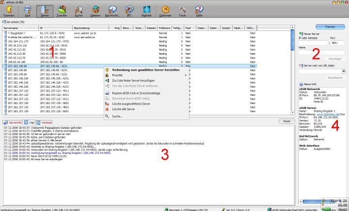Die Serverliste (1) enthält alle Server die dein eMule kennt. Du kannst sie entfernen, zu einem bestimmten Server verbinden, Prioritäten vergeben oder Server zu deiner Liste statischer (bevorzugter) Server hinzufügen, was bedeutet dass eMule sie nie löschen wird. Für gewöhnlich ist es nicht wichtig zu welchem Server du verbindest weil eMule alle Quellen findet - unabhängig davon zu welchem Server (wenn überhaupt) diese verbunden sind. Es gibt allerdings eine Menge bösartiger Server die versuchen das Netzwerk zu stören oder Geld zu verdienen indem sie Spamergebnisse bei Suchanfragen zurückgeben und deswegen solltest du sichergehen dass du eine vertrauenswürdige Serverliste verwendest (siehe unten).