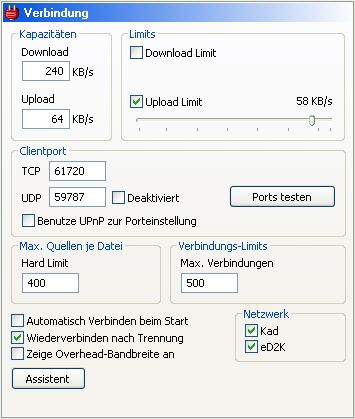 Stellt Ihr Euren Upload auf einen Wert niedriger als 10, so wird auch automatisch Euer Download begrenzt. Erst ab einem Wert von 10 fällt diese Beschränkung weg. Dies wird Ratio genannt und beträgt 1:4 für Werte kleiner 10kB/s, d.h. ein Upload-Limit von 5kB/s hat einen maximalen Download von 20kB/s zur Folge.