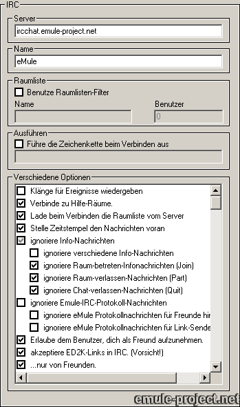 Standardmäßig ist dies ircchat.emule-project.net. Der eingetragene Server führt direkt dorthin. Hier sind auch die offiziellen eMule-Channels zu finden.