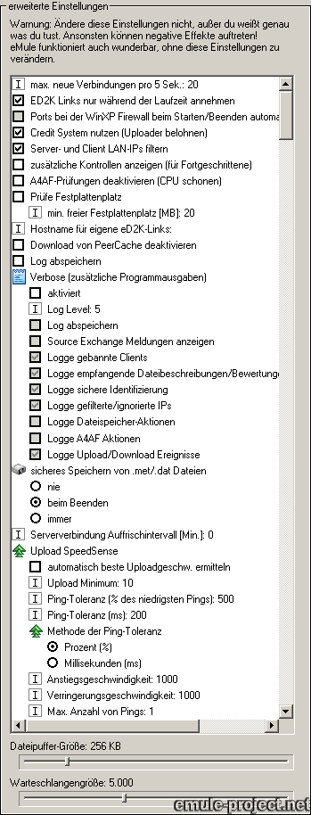 eMule. Vorsicht, zu niedrige Werte haben negative Auswirkungen auf die