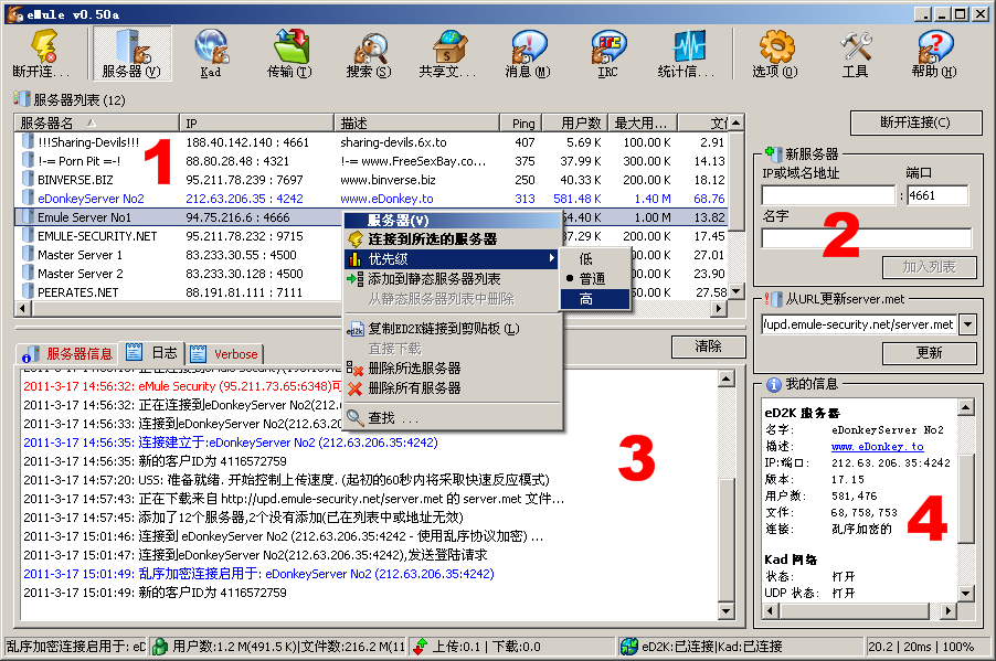 服务器列表(1)包含所有你的eMule了解的服务器。你可以删除服务器、选择连接到指定的服务器、设定优先级、将一个服务器添加到静态(收藏)列表使其不被eMule删除。一般来说连接到哪个服务器无所谓,因为无论登入到哪个服务器,eMule都能找到所有的源。但是有一些恶意服务器会尝试扰乱网络或通过发送虚假结果来牟利,因此你应该确保使用一个可信赖的服务器列表(见下)。无论如何,eMule安装包里的服务器列表算是开了个好头。只要这些服务器没过期(没有连得上的服务器),就不用更新服务器列表。