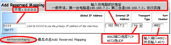 同样的工作共需做两次,一次处理4662 TCP端口,一次是4672 UDP端口。(译注:即eMule所设置的TCP与UDP端口。)